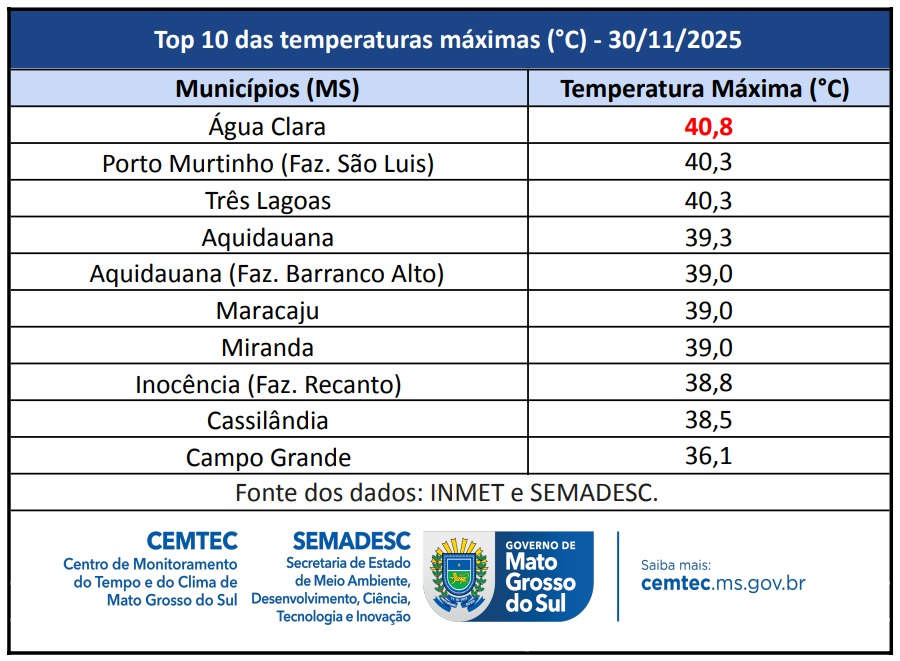 As cidades mais quentes foram Água Clara, Porto Murtinho e Três Lagoas