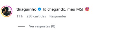Thiaguinho, inclusive, deixou um comentário no Instagram da festa, sinalizando que está animado para participar da Expogrande.