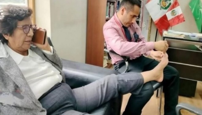 Programa de cobertura política do Peru divulgou as imagens de Lucinda sentada em um sofá com umas das pernas no colo de um assessor enquanto ele faz as vezes de manicure.